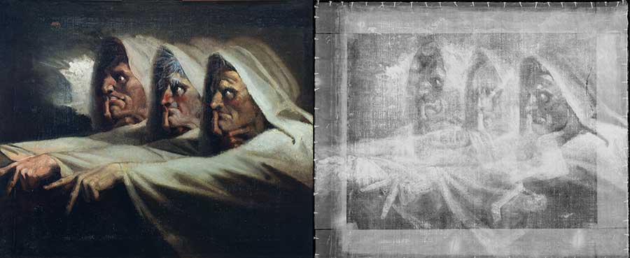 Henry Fuseli’s The Three Witches (left) and a digital X-ray of the painting. Digital X-rays provide a view through all the layers of a painting, revealing past damage or changes that an artist has made. The Huntington Library, Art Museum, and Botanical Gardens.