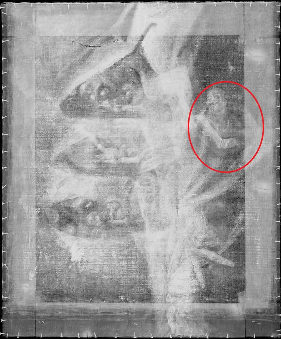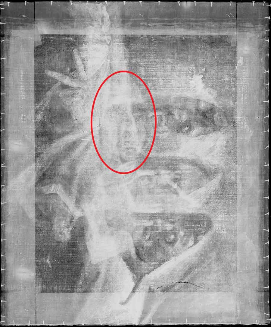 By rotating the X-ray 90 degrees clockwise, you can see a three-quarter portrait of a man. His face and collar are circled here in red. The Huntington Library, Art Museum, and Botanical Gardens.