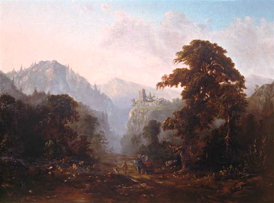 Throughout his career, Duncanson took up subjects from poetry and literature—in particular, the novels of Sir Walter Scott. However, The Huntington's Duncanson painting, bathed in rosy crepuscular light, is a moody imagined landscape that does not appear to derive from any specific literary source. With its ruined castle balanced on a sheer cliff, it is an American's dream of Europe taken from Gothic novels and epic poems. Perhaps the foreground figures immersed in shadows relate to his experience of crossing the Alps on his way from France to Italy. The picture likely dates to the period after Duncanson's return from Italy to Cincinnati. Rather than referring to a Hudson River School artist like John Frederick Kensett, whose Rocky Landscape (1853) hangs at The Huntington, Duncanson's dark picture looks to Salvator Rosa, an Italian landscape painter. This indicates Duncanson's wish to demonstrate his cosmopolitan sophistication.