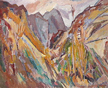 A dramatic view of a mountain pass worked with intense colors and broad, free brushstrokes, The Slopes of Navao is Bomberg’s response to the grandeur of the landscape of northern Spain, a subject that formed a major motif during the artist’s greatest period of creativity.
