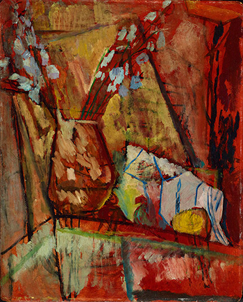 Grant painted two versions of this still life in 1913. Both are thought to have entered the collection of Lady Ottoline Morrell, the flamboyant socialite and benefactor of London’s most famous writers and artists. The Huntington’s version shows Grant’s initial exploration of the theme, seemingly painted over the outline of an earlier unrelated composition. The second version was reproduced in art critic Roger Fry’s 1924 book on Grant. The whereabouts of that version are unknown, making The Huntington’s the only available example of the boldly conceived composition.