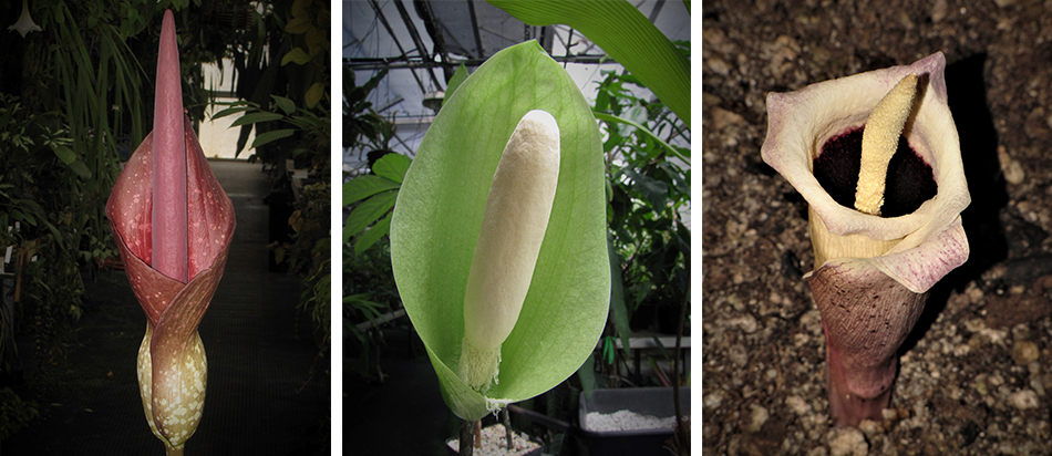 The Titan Arum is famed for its size and smell, but members of the Amorphophallus genus are tremendously varied in terms of size, shape, color, and scent. A. thaiensis (left) produces blue fruits; A. croatii (center) emits a pleasant odor; and A. juliae (right) is a newly described species from Borneo. Photos by Dylan Hannon.