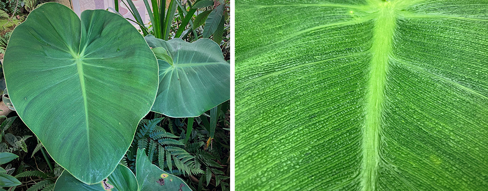 Philodendron rugosum’s common name, Pigskin Philodendron (left), is inspired by its thick, leathery leaves. A close look (right) reveals the leaf’s granular surface, which helps to bead water and gives the foliage an attractive matte finish. Photo by Sandy Masuo.