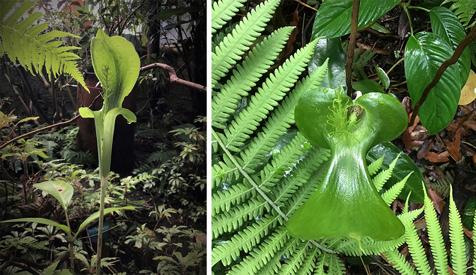 The aroid genus Arisaema includes some 200 species commonly known as Jack-in-the-Pulpits. A. balansae is native to northern Vietnam and produces beautiful green inflorescences that share the same basic structure as all aroids—a central spadix wrapped in a spathe. Photo by Sandy Masuo.