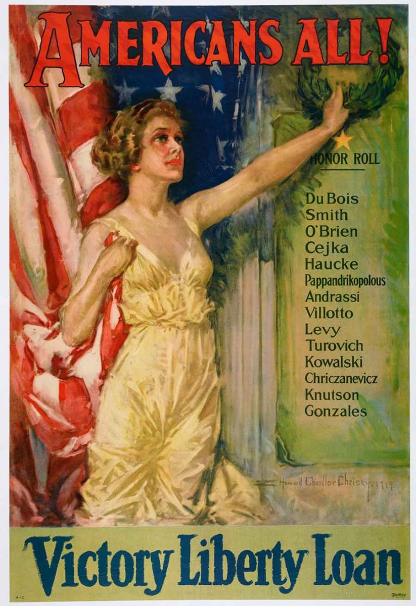 On June 28, 1919, Woodrow Wilson added his signature to the Treaty of Versailles. In the United States, though, the Senate never ratified the treaty, convinced that the League of Nations—Wilson’s vision—would compromise American autonomy. Wilson declared in 1917 that the U.S. entered the war to make the world “safe for democracy,” but throughout America, democracy found itself crippled by nationalist paranoia and racist hysteria. The government raided radical organizations, arrested suspicious individuals, and deported thousands of immigrants, even as the new Victory Loan Program celebrated the diversity of the soldiers who had fought overseas—Americans All! Across the nation, vigilante mobs destroyed black communities and murdered black men and women.