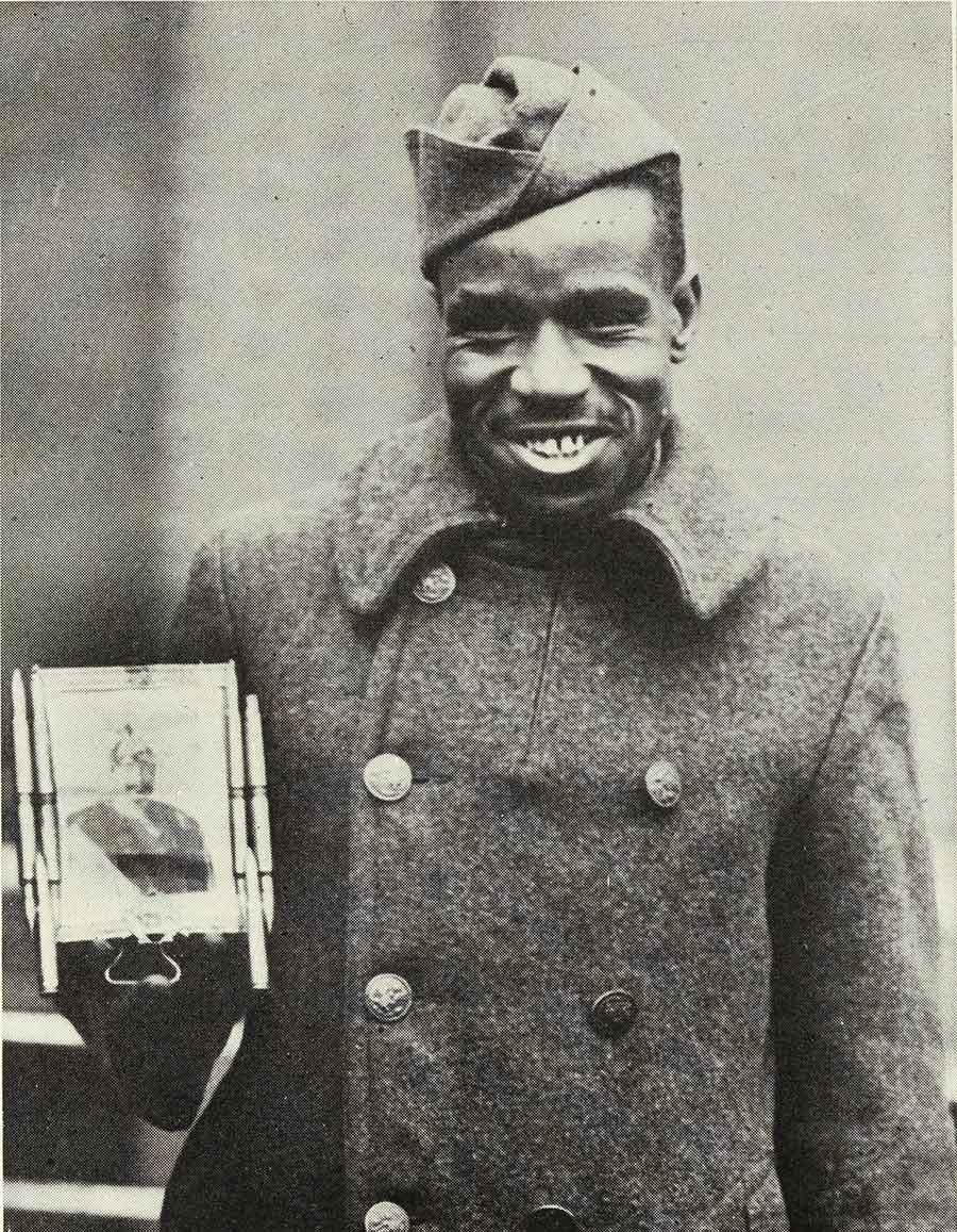 “Corporal Fred. McIntyre of the 369th Infantry with Picture of the Kaiser Which He Captured from a German Officer,” in William Allison Sweeney, History of the American Negro in the Great World War, 1919, Cuneo-Henneberry, Chicago. The Huntington Library, Art Museum, and Botanical Gardens.