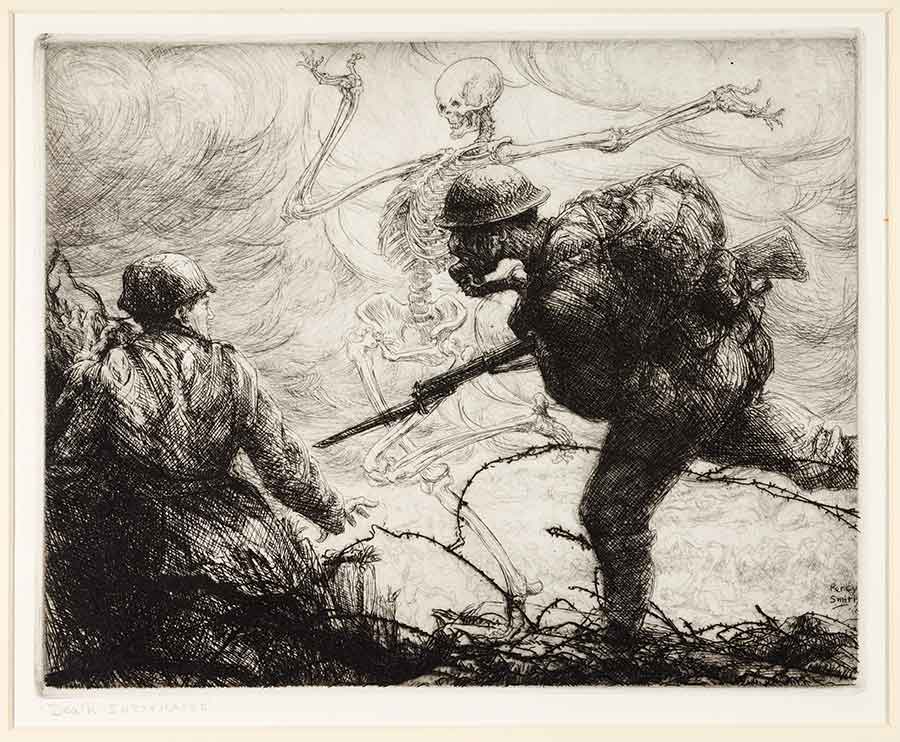 Percy John Smith, Death Intoxicated, 1919, etching, charcoal and stump on paper, 10 1/16 x 13 3/16 in., from the series The Dance of Death, 1914–19. Gift of Russel I. Kully. The Huntington Library, Art Museum, and Botanical Gardens.