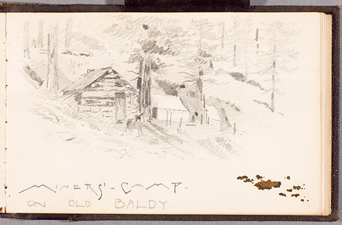 Her drawing of a miner’s camp recalls the gold mining history of the area. The Hocumac Mining Company enjoyed moderate success near Baldy Notch in the late 19th century. Percival mentions meeting Robert Brewster Stanton, the chief engineer of the mine from 1893–1894, and his family. Stanton was known as one of the first people to lead an excursion through the Grand Canyon by boat, becoming a minor celebrity. The Hocumac Mine would ultimately fail due to water-supply issues.