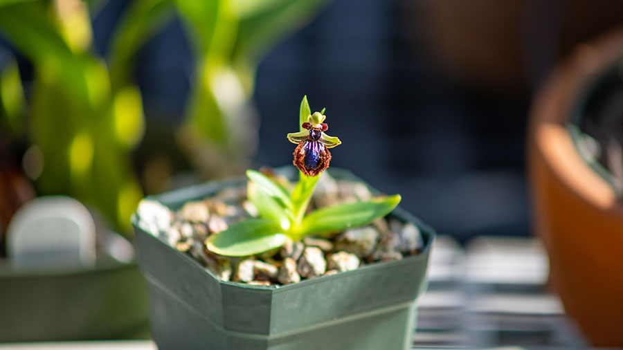 With more than 10,000 orchid plants, The Huntington’s orchid collection is one of the largest in the United States, and one of the five most diverse collections in the world, with more than 3,600 unique varieties, representing more than 1,500 species and 2,000 hybrids, across 280 genera. In summer 2020, two groups of bee orchids arrived at The Huntington, purchased from a Florida-based grower who continuously imports them from a European nursery and propagator. These new arrivals filled an important niche in the collection.