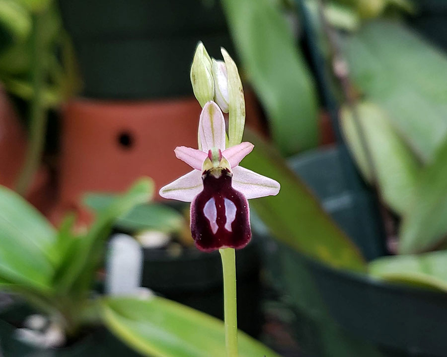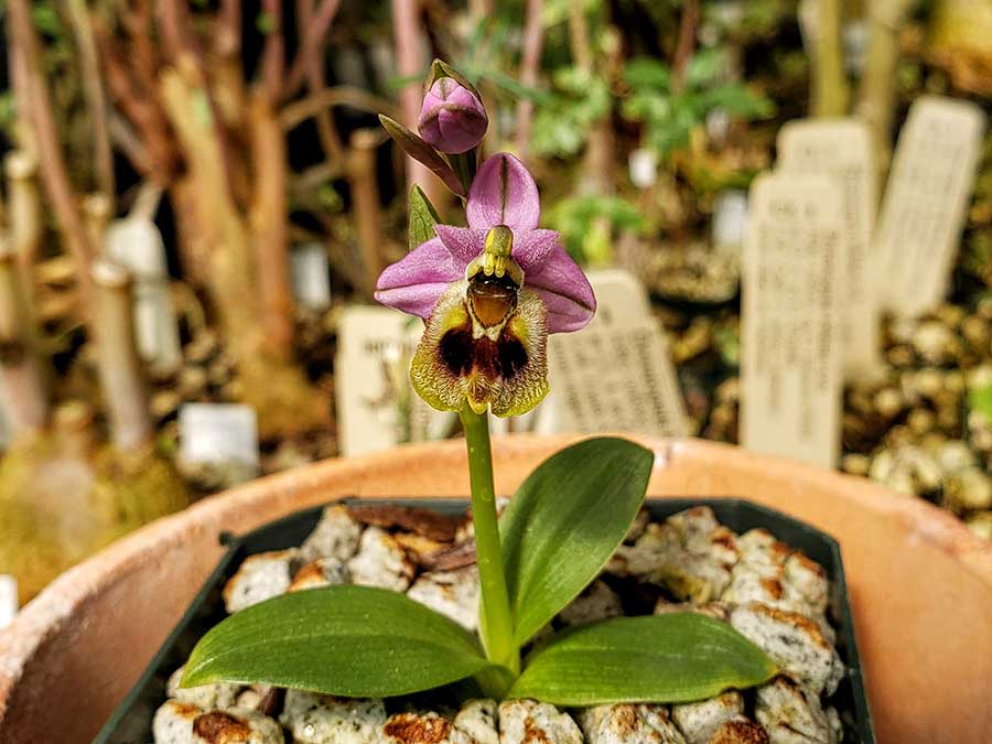 “People are surprised to find out that orchids are found on every continent in the world except Antarctica,” comments Huntington Orchid Collection Specialist Brandon Tam. “Even though our collection is incredibly diverse, it dawned on me one day that we had orchids representing every continent except Europe. To further illustrate the diversity of orchids around the world, we made it our goal to have this continent represented through the genus Ophrys. Though members of this genus are incredibly easy to grow outdoors in Southern California, they are difficult to find in cultivation within the United States.”