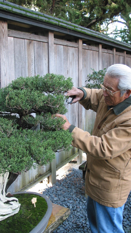 On a recent stroll through the Bonsai Court, where dozens of outstanding examples of bonsai are displayed year round, Oki talked about his craft. Behind him, a miniature camellia tree covered with pink flowers was responding to the same seasonal call as its full-sized counterparts in the Japanese Garden. Oki pointed out one of his favorite trees, a California juniper grown from a half-dead stump estimated to be more than 350 years old. Its rebirth as a bonsai started 50 years ago. A strong and healthy trunk now curves gracefully around the bleached white bones of the dead wood. Its vigorous branches extend skyward.