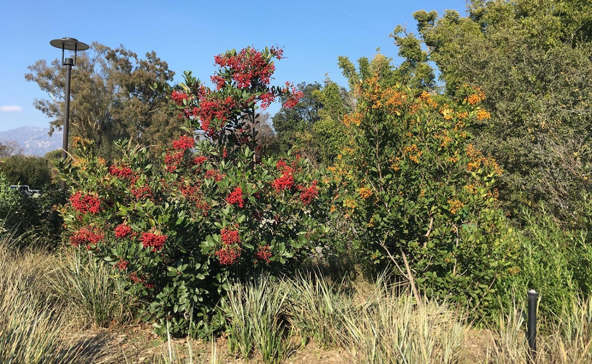 Toyon is brightening winter landscapes throughout Southern California, including here at The Huntington. Also known as California holly, this native plant is producing a bounty of festive scarlet berries in several easy-to-spot locations: near the vehicle drop-off/pickup area next to Admissions, in the Steven S. Koblik Education and Visitor Center, as well as in the Stroll Garden and the Shakespeare Garden.