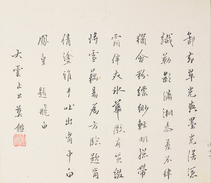 This postscript to the “Heaven” album, 1860, by an unidentified Japanese artist writing in classical Chinese, reads in part, “This manual . . . is exquisitely carved and printed and is truly a rare specimen. Recently, I borrowed it for viewing over the course of several days, thus finally being able to observe it in full. This is truly a pure blessing for my studio. Having viewed the work, I register my joy.” Ten Bamboo Studio Manual of Calligraphy and Painting, ca. 1633–1703, woodblock-printed book mounted as album leaves, ink and colors on paper. The Huntington Library, Art Collections, and Botanical Gardens.