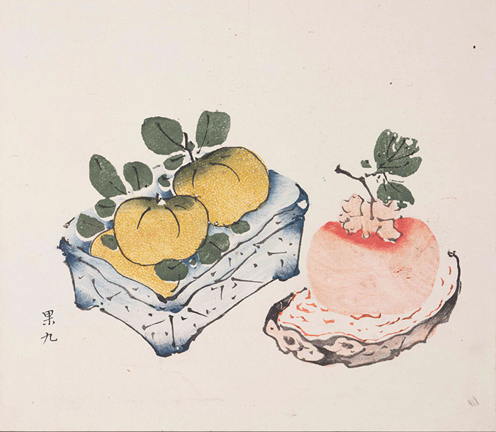 Persimmon and tangerines, Fruit 9, Ten Bamboo Studio Manual of Calligraphy and Painting, ca. 1633–1703, woodblock-printed book mounted as album leaves, ink and colors on paper. The Huntington Library, Art Collections, and Botanical Gardens.