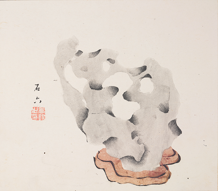 Rock on stand, Rock 6, Ten Bamboo Studio Manual of Calligraphy and Painting, ca. 1633–1703, woodblock-printed book mounted as album leaves, ink and colors on paper. The Huntington Library, Art Collections, and Botanical Gardens.