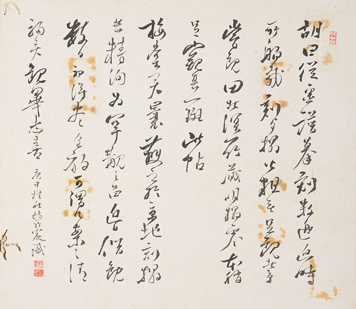 Lines of verse from Mo Jian describe the ways in which the flecks of ink from a dry brush, typically referred to as “flying white,” capture bamboo leaves. His words begin: “Sloughing off both vibrant green and darker hue, / Its delicate leaves capture the reflections of the Xiang River.” Bamboo 11, Ten Bamboo Studio Manual of Calligraphy and Painting, ca. 1633–1703, woodblock-printed book mounted as album leaves, ink and colors on paper. The Huntington Library, Art Collections, and Botanical Gardens.