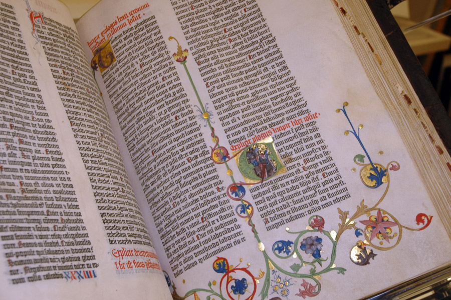 The Gutenberg Bible's text, printed with movable type, resembles the calligraphy of medieval scribes who copied books by hand before Johann Gutenberg revolutionized the printing process. The decorative illuminations were added by hand after the pages were printed. The page opening shows the first chapter of the Book of Joshua.