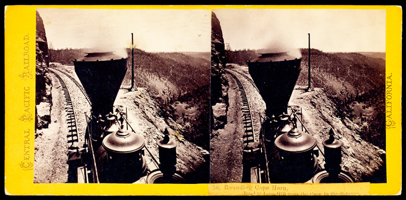 The current exhibition "Visions of Empire: The Quest for a Railroad Across America, 1840–1880" tells the story of the extraordinary achievement and implications of the first transcontinental railroad. In the 1860s, photographer Alfred A. Hart followed the progress of workers as they punched the Central Pacific Railroad through the Sierras. These photographs became the basis for a set of stereo cards; two seemingly identical images on each card are combined in the brain when placed into a stereoviewer, giving the perception of three-dimensional depth. In the exhibition some 300 of the available 337 Hart stereo cards from The Huntington are mounted on the wall of the education room. It is an awe-inspiring sight.