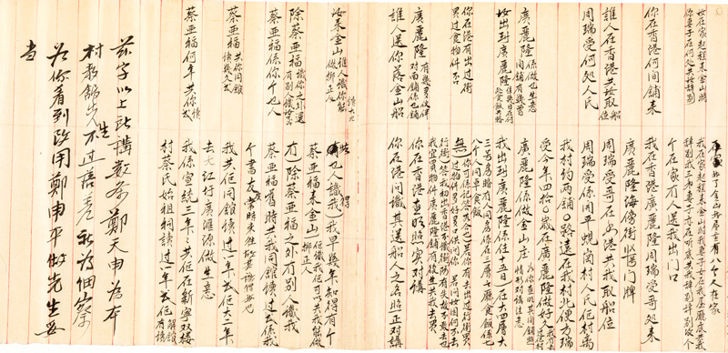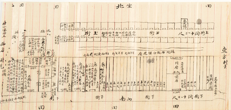 Hong’s collection documents more than 7,000 immigration cases from 1904 to 1965, including more than 600 coaching papers from the era of the Exclusion Act. Many of them, including the examples illustrated here, were in the form of long scrolls, testimonies to the level of detail required to gain entrance to the United States. In many instances, diagrams (such as the one below) showed maps of villages or house plans.