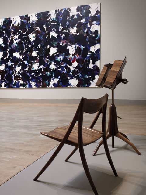 The curators—Jessica Todd Smith, Harold B. "Hal" Nelson, and Kevin Murphy—were planning the reinstallation of the Virginia Steele Scott Galleries of American Art, and they hoped to borrow something from the famed artist that would best represent not only his craftsmanship but also his central role in the arts and crafts community of Southern California. An article in Huntington Frontiers from Spring/Summer 2009 describes the moment they spotted the Double Music Stand and Musician's Chair, which Maloof had made in 1972 for his friend Jan Hlinka, then a violist for the Los Angeles Philharmonic.