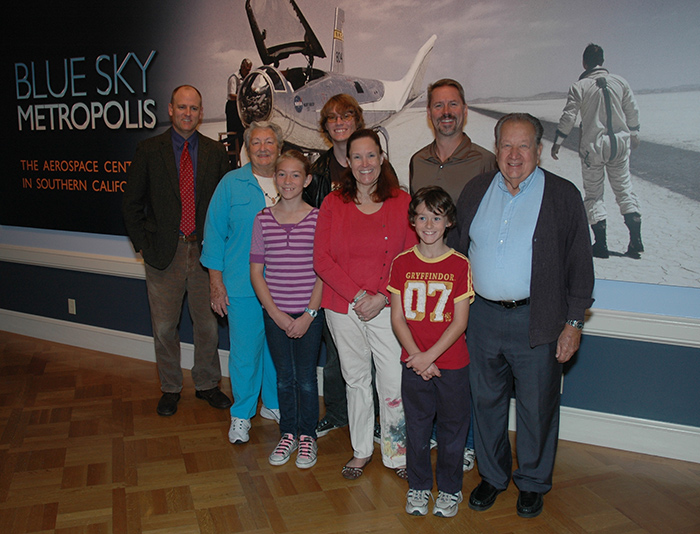 Peter Westwick, the director of the Aerospace History Project with Carol Basney (in blue) and Burt Basney (far right). They came to see the exhibition with their daughter Barbara Van De Velde (in red), son-in-law Jim, and grandchildren Rachel, Josh, and Joe.