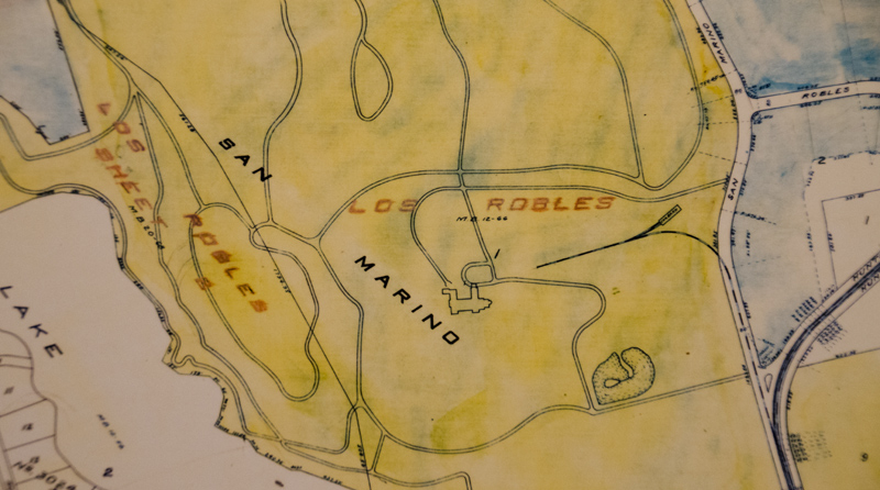 Detail from a 1913 map of the city of San Marino. When the city of San Marino was founded in 1913, Henry E. Huntington and his Huntington Land and Improvement Company owned a large portion of the land. In this map, Huntington's ranch is labeled both Los Robles and San Marino.