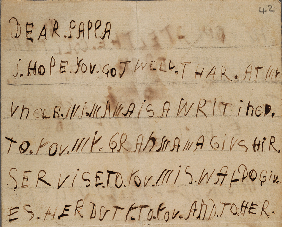 If you read the letter aloud, you might think it was written by a young woman responsible for maintaining personal connections within her family and wider social network, as the contents are filled with mentions of “grandma” and “mama” sending their “service” to her father. But to see the words written in the hand of a girl taking her first steps toward literacy is charming.