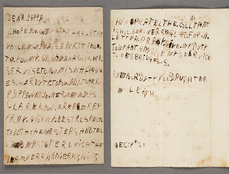 In 1736, just four days before Christmas, 5-year-old Mary “Molly” Leigh wrote a formal letter to her father, Theophilus Leigh, Master of Balliol College, Oxford. The first page of the letter is ruled with straight lines to serve as guides for the novice hand, but the second page lacks them. Molly’s carefully shaped letters gently brush the lines in some places and float just above them in others, giving a subtle movement to her focused penmanship.