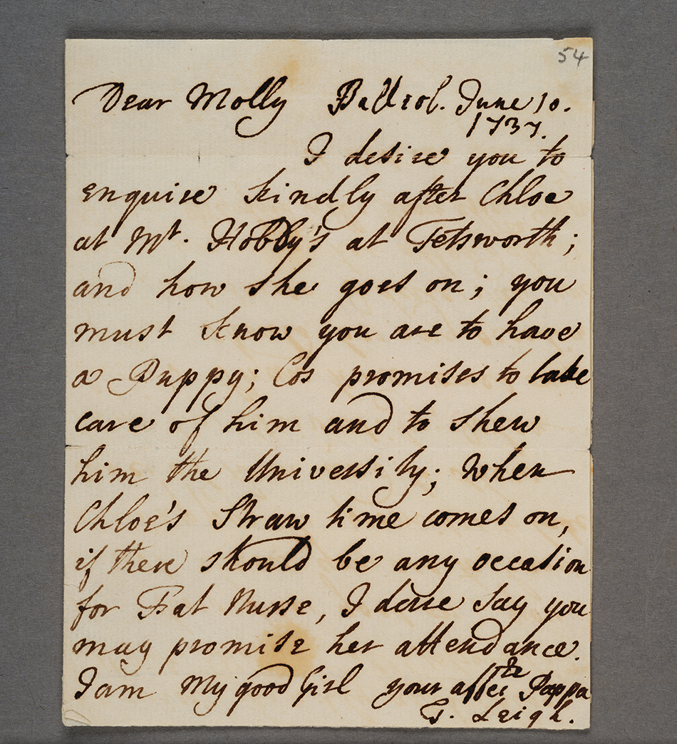 Letter by Theophilus Leigh, Master of Balliol College, Oxford, to his young daughter, Mary “Molly” Leigh, June 10, 1737. The father writes: “… you must know you are to have a puppy ….” The Huntington Library, Art Museum, and Botanical Gardens.