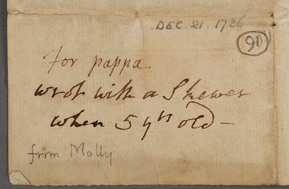 Mary “Molly” Leigh’s annotation on the letter she addressed to her father on Dec. 21, 1736: “wrote [it] with a skewer when 5 yrs old.” The Huntington Library, Art Museum, and Botanical Gardens.