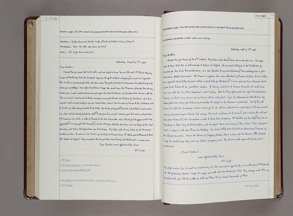 The papers were passed down through the line of Molly’s sister, Cassandra Leigh Cooke, and remained in the family’s hands for more than 200 years. In the mid-20th century, another Leigh descendant, Gwen Beachcroft, became the family archivist. Building on Molly’s practices, Beachcroft carefully transcribed each letter by hand and added her own footnotes to her transcriptions, bound in three comprehensive volumes. These volumes are also part of The Huntington’s new acquisition and add even more detail about who people were, how they were connected, and how some of the letters were bundled together for mailing.