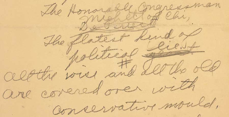 A notable change in the hand-corrected text is the substitution of the phrase "Michell [sic] of Chi" for the name “DePriest." Oscar DePriest was the first Black person elected to the U.S. House of Representatives in the 20th century. He represented the 1st congressional district of Illinois, including the South Side of Chicago. On Nov. 6, 1934, Arthur Mitchell, a Democrat, defeated DePriest, a Republican, to become the second Black person and first Black person as a Democrat to be elected to the U.S. House of Representatives. (Incidentally, this seat has been held by an African American ever since.)