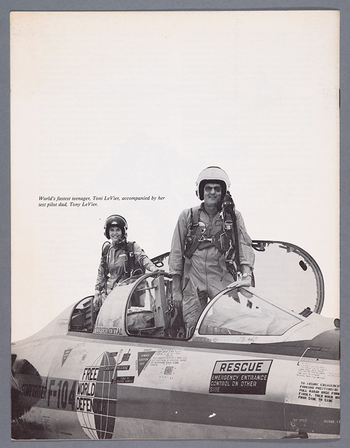 One of my favorite finds in the LeVier papers is a shot of him and his teenaged daughter Toniann in a two-seater supersonic Starfighter, complete with a decal on the fuselage that reads: “FREE WORLD DEFENDER.” The photographer caught father and daughter on the tarmac during a promotional tour from California to Washington, D.C., in May of 1963. Between promotional stops, Toniann switched seats with her dad and cranked the plane up to Mach 2 over the Mojave Desert, a feat that got her labeled “America’s fastest teenager” by Parade magazine. I’ve seen photos elsewhere of LeVier that show him with his test-pilot face on, all attitude and aviator shades. In The Huntington’s photo, however, he’s smiling broadly, a father proud of his kid, all of 19 at the time, decked out in a custom-tailored flight suit.