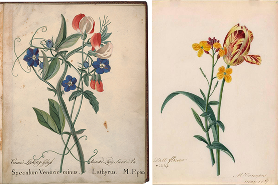Left: Mary Parker, Countess of Macclesfield (ca. 1761–1823), Venus’s Looking-Glass and Painted Lady Sweet Pea, undated, watercolor on parchment, 9 1/2 x 8 3/4 in. The Huntington Library, Art Museum, and Botanical Gardens. Right: Matilda Conyers (ca. 1698–1793), Wallflower and Tulip, 1767, watercolor and opaque watercolor over traces of graphite with brown ink (est. iron gall) inscriptions on vellum, 9 x 6 1/4 in. The Huntington Library, Art Museum, and Botanical Gardens. Earlier this year, The Huntington acquired two albums of watercolor botanical drawings by Mary Parker, Countess of Macclesfield (ca. 1761–1823), and her daughter Lady Elizabeth Parker Fane (1751–1829), both students of Ehret. The illustrations, including this depiction of local flora, masterfully blend their artistic skill and deep botanical knowledge, marked by the unmistakable influence of their instructor. Matilda Conyers’ drawing of a wallflower and a tulip, featured in the exhibition “100 Great British Drawings,” shows the influence of Ehret, who may have been her instructor. An album with drawings by Conyers and her niece Henrietta Conyers also includes works by Ehret.