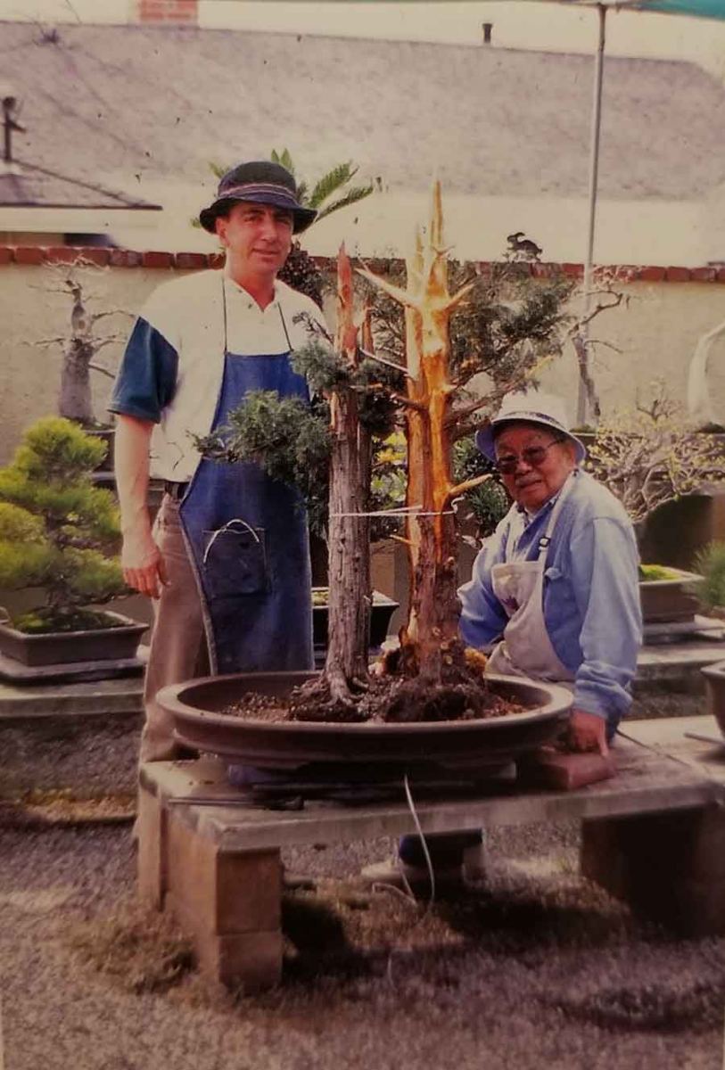 Jack Sustic (left) assisted John Naka (right) in replicating his famous bonsai, “Goshin,” in 2000. An earlier replica of "Goshin" had been planted in 1999. Photo courtesy of Jack Sustic.