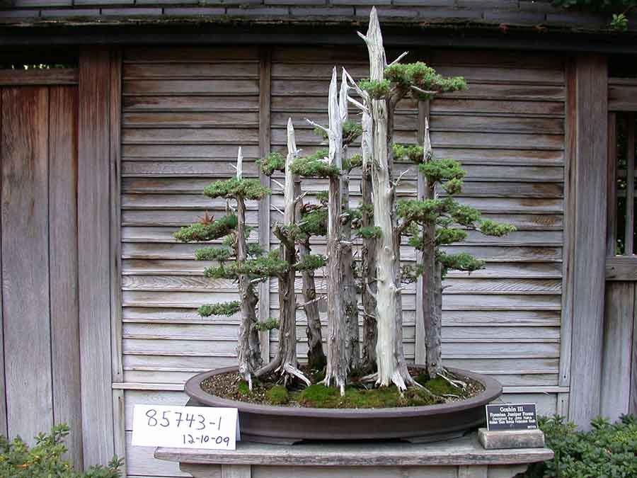 Ask any bonsai aficionado to name the most famous bonsai in North America, and the answer will almost certainly be "Goshin." Indeed, it is one of the most widely recognized examples of the art form in the world. A masterpiece begun in 1958 by the legendary bonsai master John Naka (1914–2004), "Goshin," or Guardian of the Spirit, is a forest-style planting of 11 Chinese junipers (Juniperus chinensis). Each tree represents one of Naka's grandchildren. The upright trunks and outstretched branches evoke a sense of hope in the promise of the future.