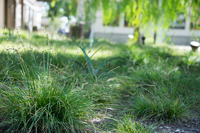 This short, grass-like sedge, Carex divulsa, grows under pepper trees near the parking lot. Photo by Kate Lain.
