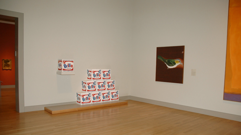 Then there's the grouping of the Brillo Boxes. Jessica Todd Smith, Virginia Steele Scott Chief Curator of American Art, who oversaw the new installation, arranged the boxes so that the original hovers above and to the left of a pyramid of the later copies, drawing a clear distinction between the two (though even without that arrangement, a closer look would reveal an almost charming hand-made quality to the original, unlike the newer, more pristine, copies).