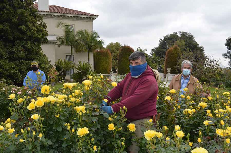 Rose Garden curator Tom Carruth (far right) and gardeners John Villarreal (center) and Noel Aviña (left) maintain physical distancing and wear face masks for added safety while tending the garden during the mandated closure as a result of the COVID-19 pandemic. With some 1,200 varieties of roses coming into full bloom (including the bright yellow floribunda, ‘Sparkle & Shine’), Carruth and his colleagues miss being able to share the beauty of the garden with others. A reopening date has not yet been determined. Photo by Kelly Fernandez.