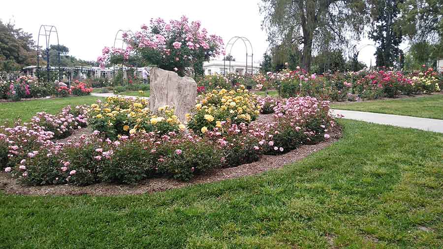 Outside the Rose Garden Tea Room, which is also temporarily closed, gardener Noel Aviña tends a colorful bed of blooms: yellow ‘Sun Flare’ roses, the peachy-pink ‘Jump for Joy’, and magenta ‘Outta the Blue’. Working in the garden, Aviña says, “helps to keep my mind away from the current crisis.” Photo by Tom Carruth.