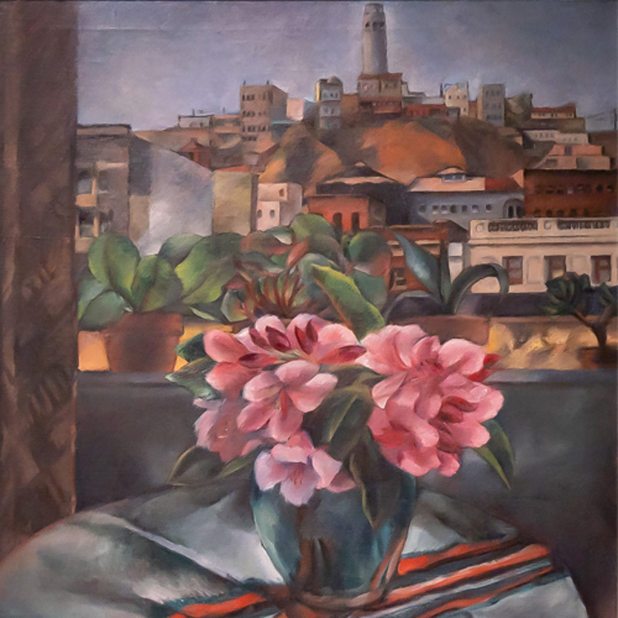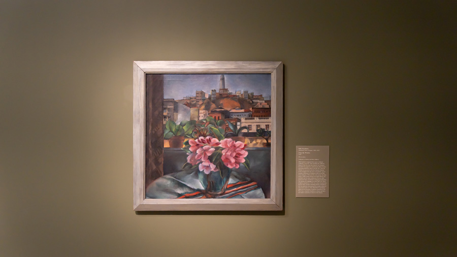 Miki Hayakawa’s From My Window—on loan from the collection of Sandra and Bram Dijkstra in The Huntington’s Virginia Steele Scott Galleries of American Art—captures a specific place and time. Hayakawa (1899–1953) painted this view from her home near the northeastern corner of San Francisco, just a few blocks from Telegraph Hill, in 1935. At the center of the canvas is a vase filled to its brim with bright pink blooms, some drooping and some still waiting to open. The vase sits on a vibrantly striped tablecloth, near a checkered brown curtain pulled back to reveal the buildings dotting the hill—at the top of which stands the imposing Coit Tower. A still life that denotes an exact dot on the map, this painting is a window into the movements and displacements of Hayakawa’s life as an Asian American woman and modernist painter in pre–World War II California.