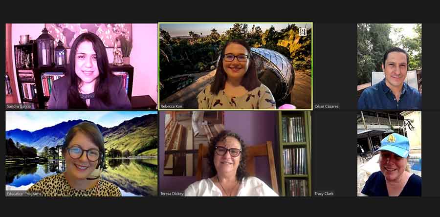 A four-member Teacher Advisory Panel meets regularly with The Huntington's Education staff to develop new classroom resources and lesson plans based on The Huntington's collections. During the pandemic, the meetings have been held online. Top row, left to right: Sandra Garcia, secondary social studies and dual immersion program teacher with the Glendale Unified School District; Rebecca Kon, curriculum development specialist at The Huntington; César Cázares, Spanish teacher at Pasadena Waldorf School. Bottom row, left to right: Louise Hindle, associate director of school partnerships and programs at The Huntington; Teresa Dickey, English instructor at Marymount High School, Los Angeles; Tracy Clark, English teacher at Torrance High School. Photo by Rebecca Kon. The Huntington Library, Art Museum, and Botanical Gardens.