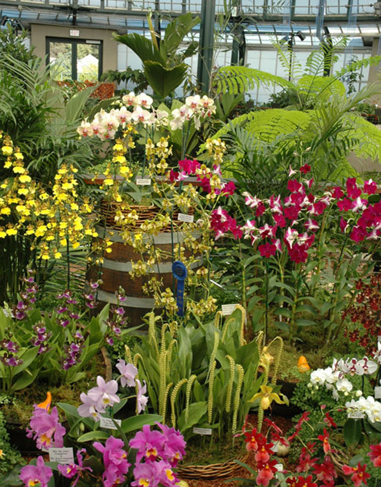 At the orchid show, exhibitors from across the southland are joined by international orchid growers as they display their best blooms for the benefit of judges and the public alike. Large, creatively designed floor installations and intricate tabletop compositions feature hundreds of exotic oncidiums ("Dancing Ladies"), brassias ("Spider Orchids"), paphiopedilums ("Lady Slippers"), and miltonias ("Pansy Orchids"), as well as cattleyas, cymbidiums, vandas, epidendrums, and many other orchid species and hybrids.