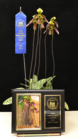 "For our first year we did better than we expected," says Tam, honored to have received five first place ribbons, including the Wilcox Trophy for Best Paphiopedilum in Show (Paphiopedilum hainanense 'Hang Ten').