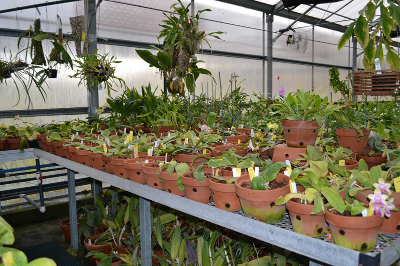 I recommend repotting orchids into bark that is of medium grade. Bark retains less water, which means you have to water it more frequently, but it will give your plant plenty of air and a better chance of surviving. Don't get me wrong. Sphagnum moss is great for orchids, but it doesn't give beginners the leeway they need to get a feel for managing the wetness levels of their new plants. At The Huntington, we stress the importance of air flow to a great extent. We repotted our whole collection of Phalaenopsis orchids into clay pots that have hand-drilled holes that provide better aeration for the plant. Terra cotta pots also dry out a bit quicker than the typical plastic that orchids comes in.