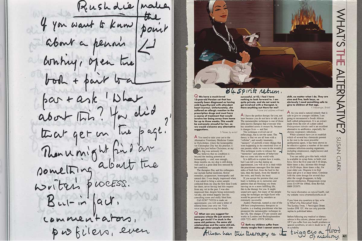 Left: Extract from a small pocket notebook of Hilary Mantel’s research notes. The Huntington Library, Art Museum, and Botanical Gardens. Right: Hilary Mantel’s notes on “What’s the Alternative,” an advice column in the Style Magazine of the Sunday Times. The Huntington Library, Art Museum, and Botanical Gardens.