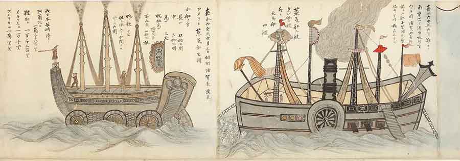 Detail from a scroll depicting U.S. Commodore Matthew C. Perry’s first expedition to Japan, ink (brush and wash) in red, blue, black, and brown, on paper recently backed. Japan, after 1853. The Huntington Library, Art Museum, and Botanical Gardens.