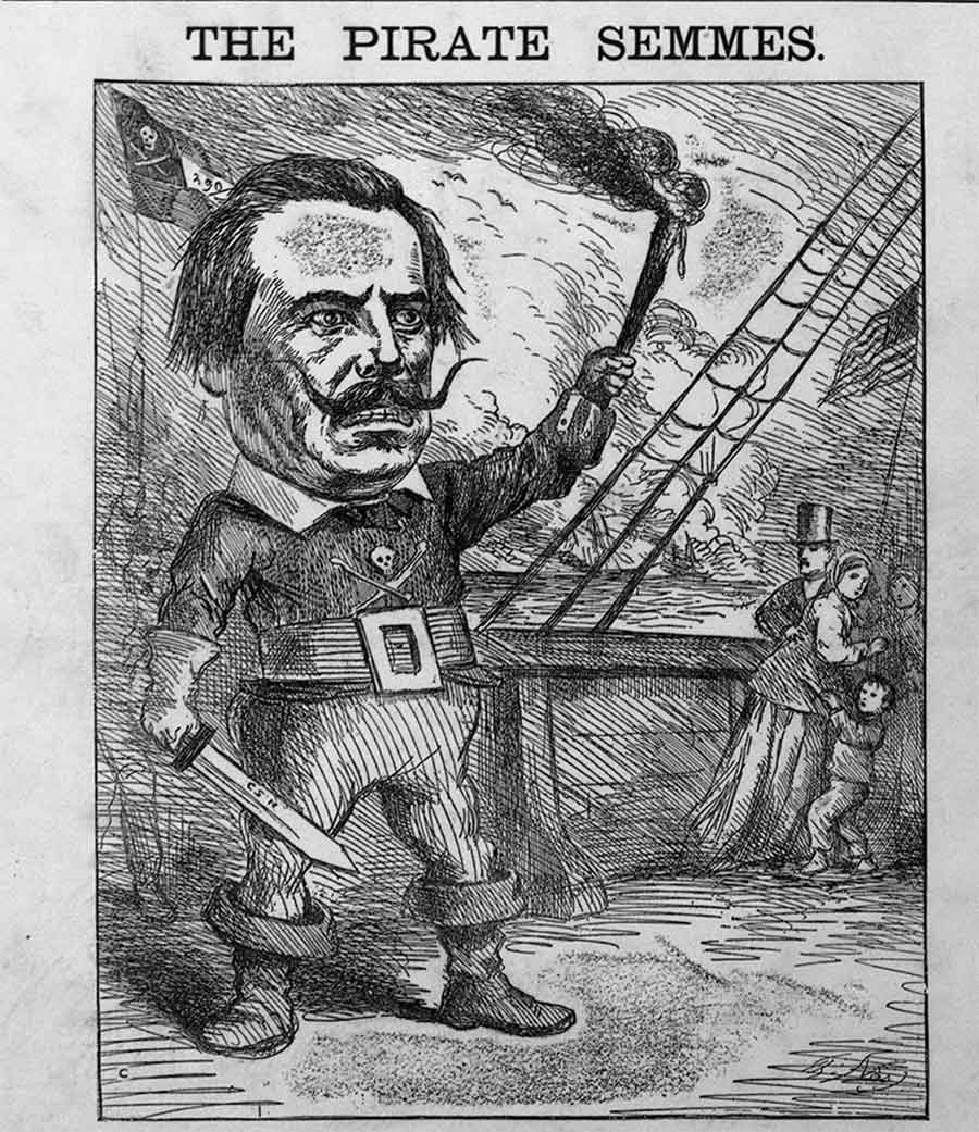 Thomas Nast (1840–1902), detail from Leaders of the Democratic Party, 1868, one print: wood-engraving with letterpress on wove paper, 89.7 x 54 cm (sheet). Library of Congress Rare Book and Special Collections Division, Washington, D.C. During an election year, Nast portrayed this prominent figure in the Democratic party, Confederate admiral Raphael Semmes (1809–1877), as a pirate, wielding a knife in one hand and holding aloft a flaming torch in the other. Semmes was the scourge of Union shipping during the Civil War. Under his command, the Alabama, a British-built ship, captured 62 merchant vessels, most of which were burned. Image courtesy of the Library of Congress.
