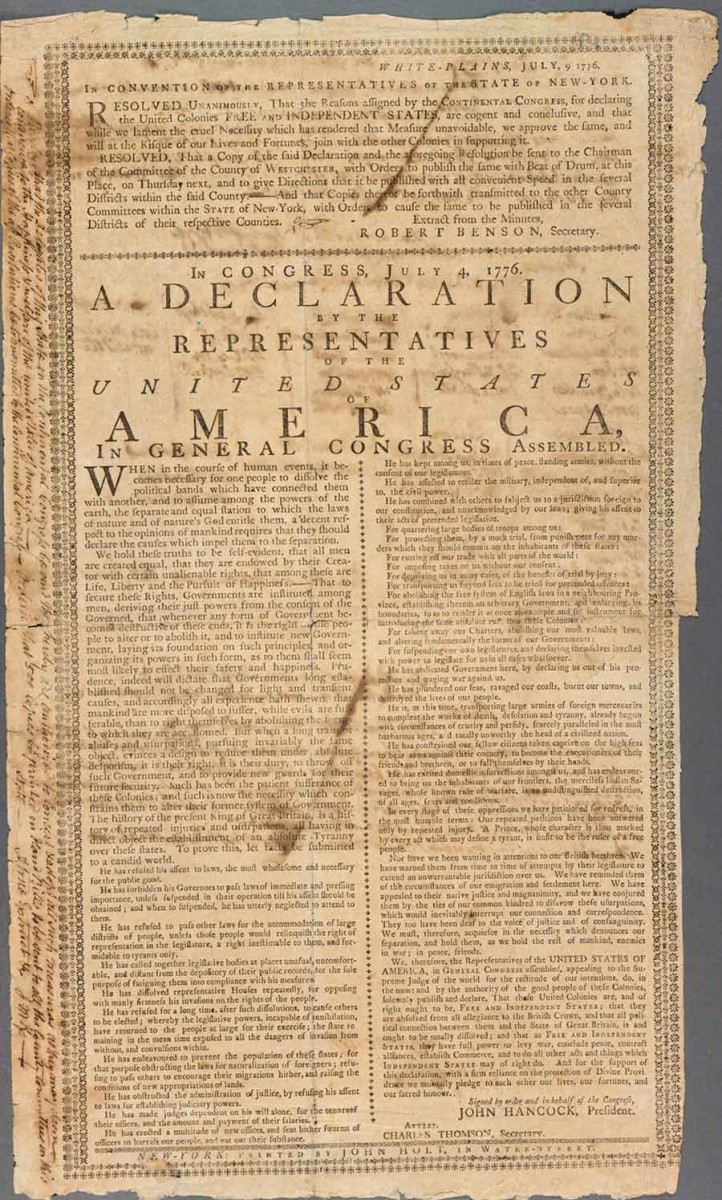 Declaration of Independence, New York: Printed by John Holt, in Water Street, 1776. The Huntington Library, Art Museum, and Botanical Gardens.