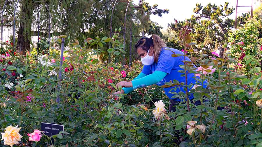 Reader Services Coordinator Karina Sanchez could no longer work in the Library when it was closed in March due to the COVID-19 pandemic. She seized the opportunity for a work reassignment in The Huntington’s botanical gardens, where she acquired new skills, such as how to prune roses. Photo by Aric Allen.